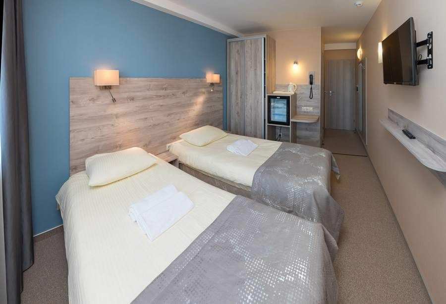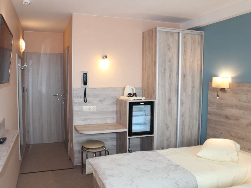 Площадь номера - 13 кв.м. 2 осн. места. 1 доп. место. Балкон. Мебель: вешалка, зеркало, кровати односпальные, прикроватные тумбочки, стол, стулья, шкаф-купе. Оборудование: мини-холодильник, телевизор, телефон, чайный набор посуды, электрочайник. Санузел: с душем, туалетные принадлежности. Сервис: Wi-Fi бесплатно, смена полотенец, смена постельного белья, уборка номера.